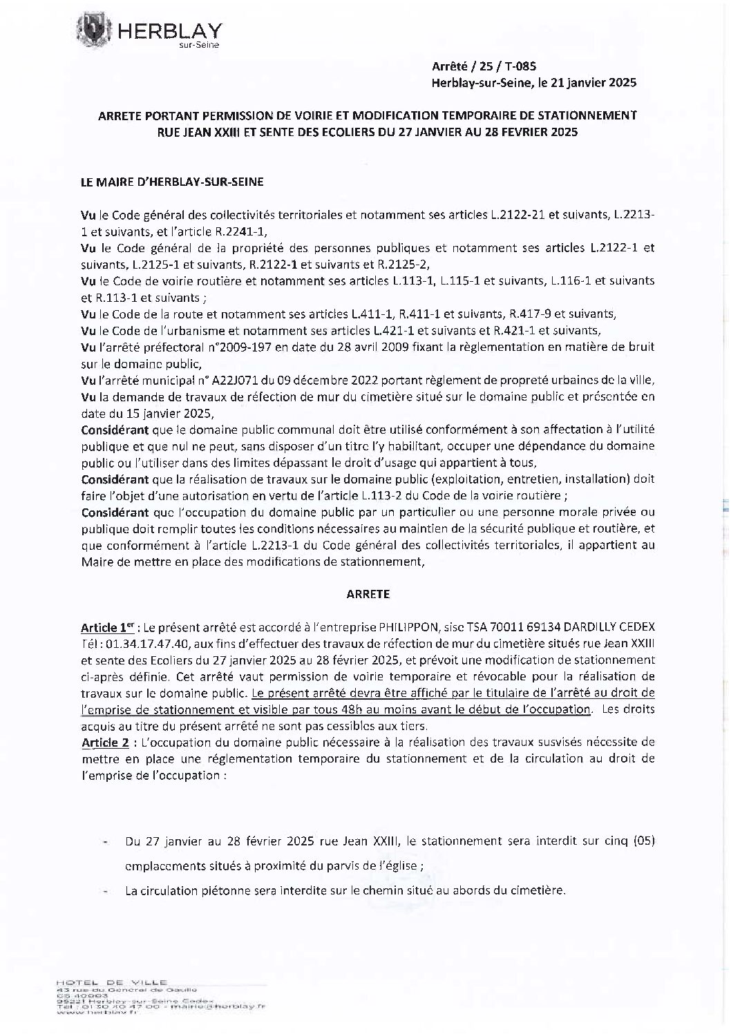 Arrêté portant permission de voirie et modification temporaire de stationnement et de circulation rue Jean XXIII