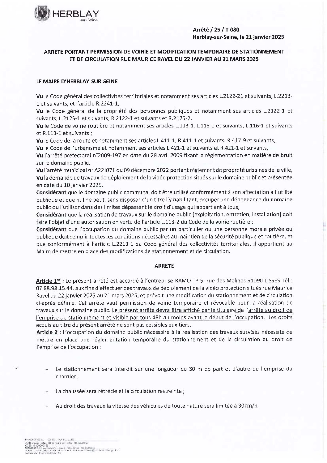 Arrêté portant permission de voirie et modification temporaire de stationnement et de circulation rue Maurice Ravel