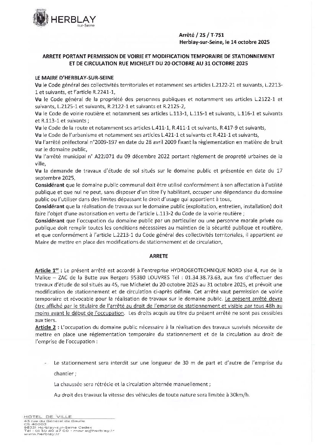 Arrêté portant permission de voirie et modification temporaire de stationnement et de circulation rue Michelet