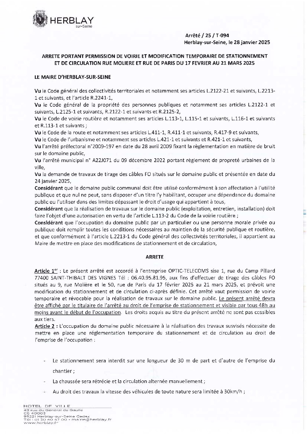 Arrêté portant permission de voirie et modification temporaire de stationnement et de circulation rue Molière et rue de Paris