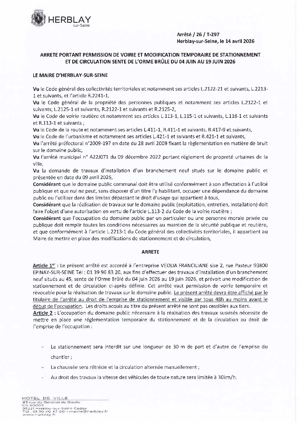 Arrêté portant permission de voirie et modification temporaire de stationnement et de circulation sente de l’Orme Brûlé