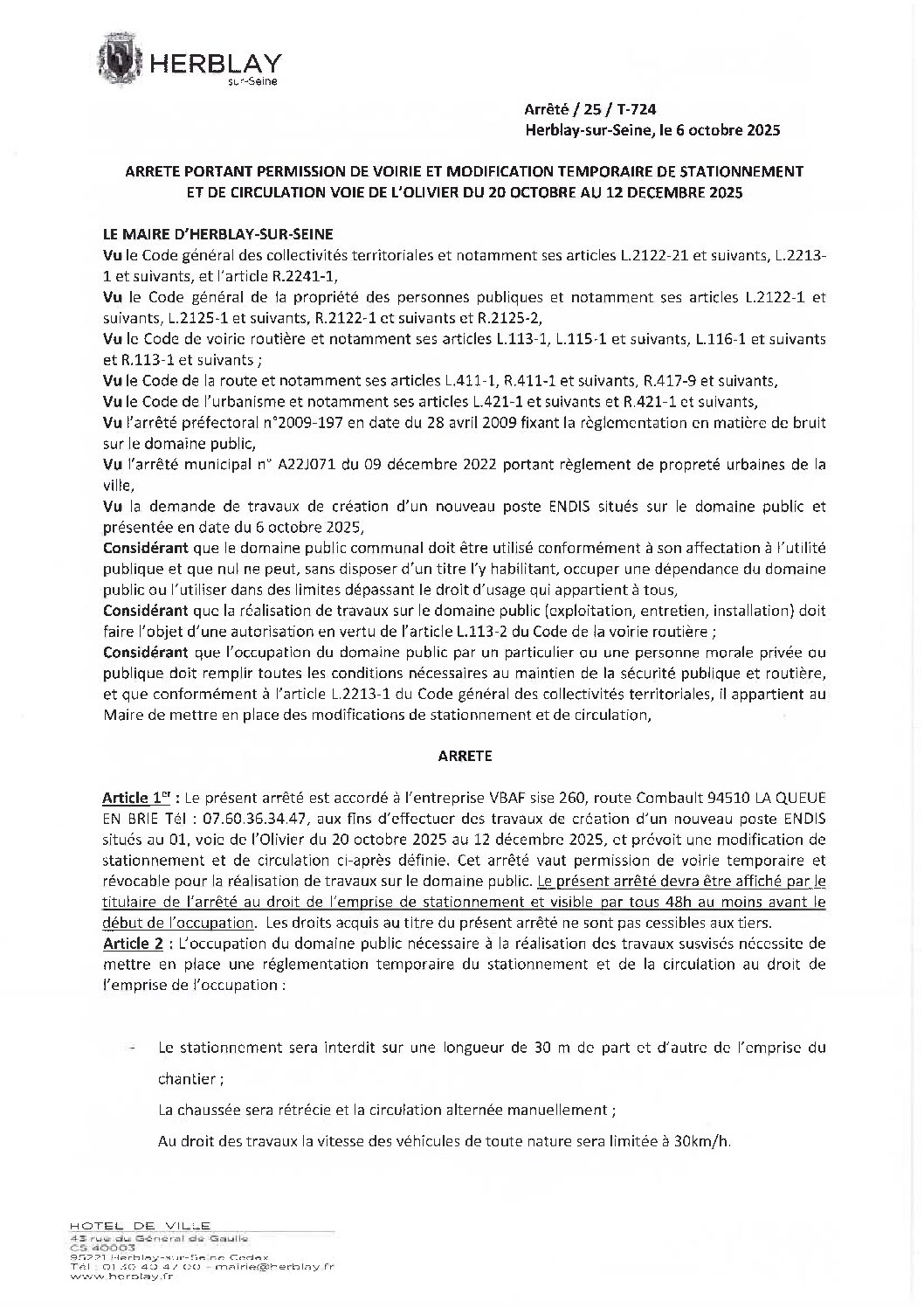 Arrêté portant permission de voirie et modification temporaire de stationnement et de circulation voie de l’Olivier