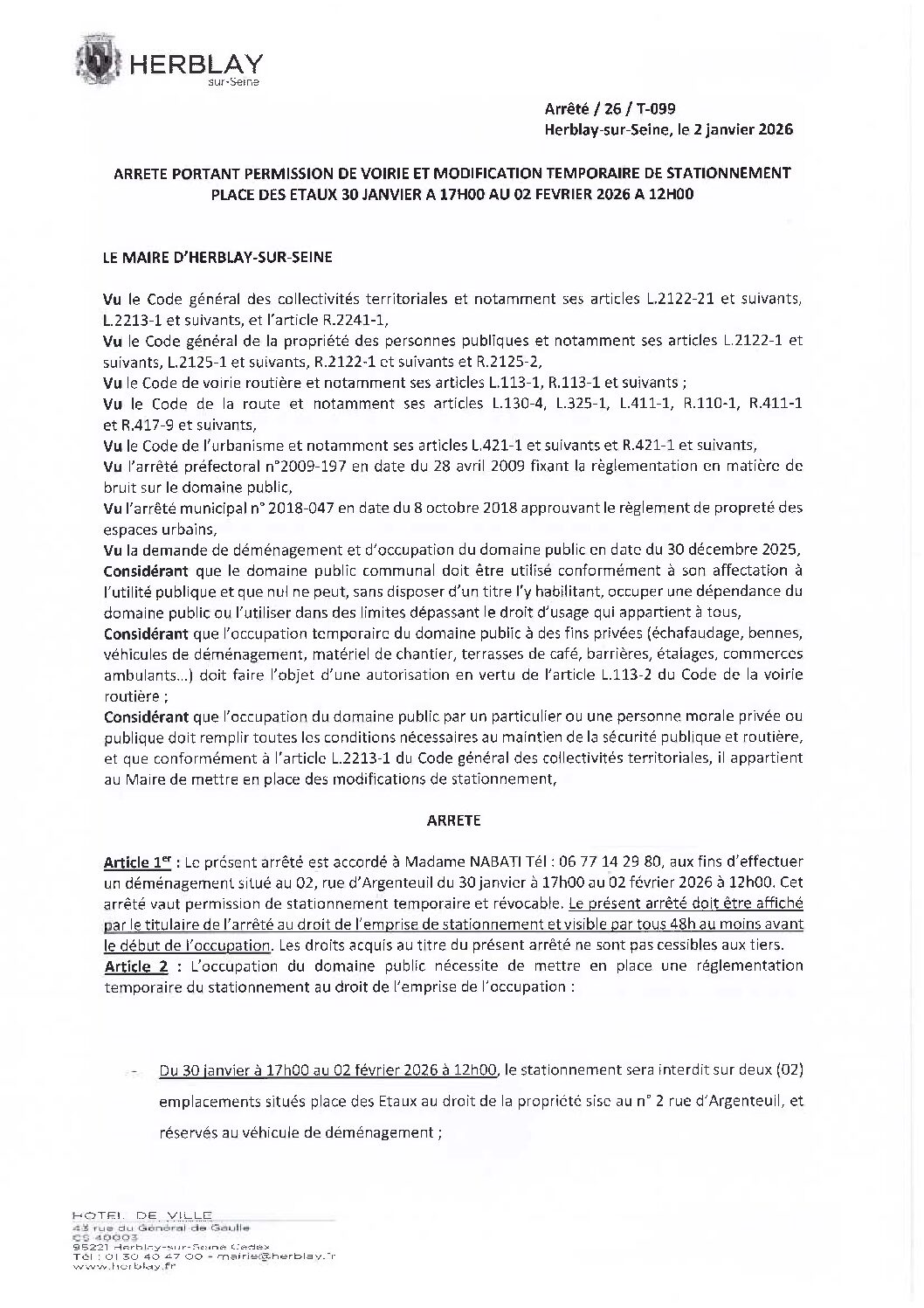 Arrêté portant permission de voirie et modification temporaire de stationnement place des Étaux
