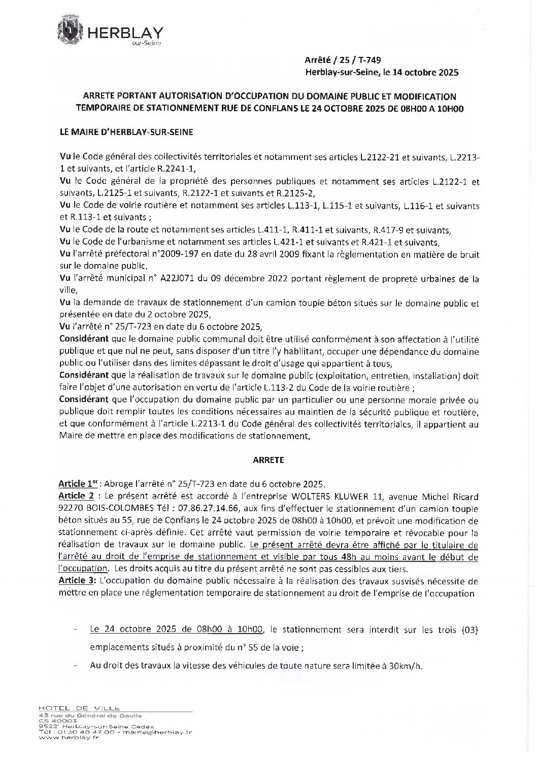 Arrêtés : Arrêté portant permission de voirie et modification temporaire de stationnement rue de Conflans 14 octobre 2025