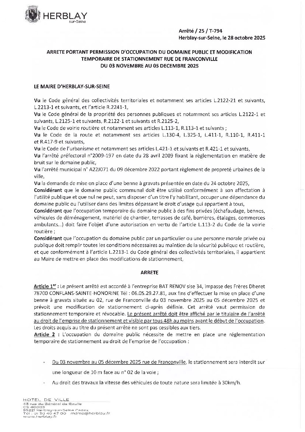 Arrêté portant permission de voirie et modification temporaire de stationnement rue de Franconville