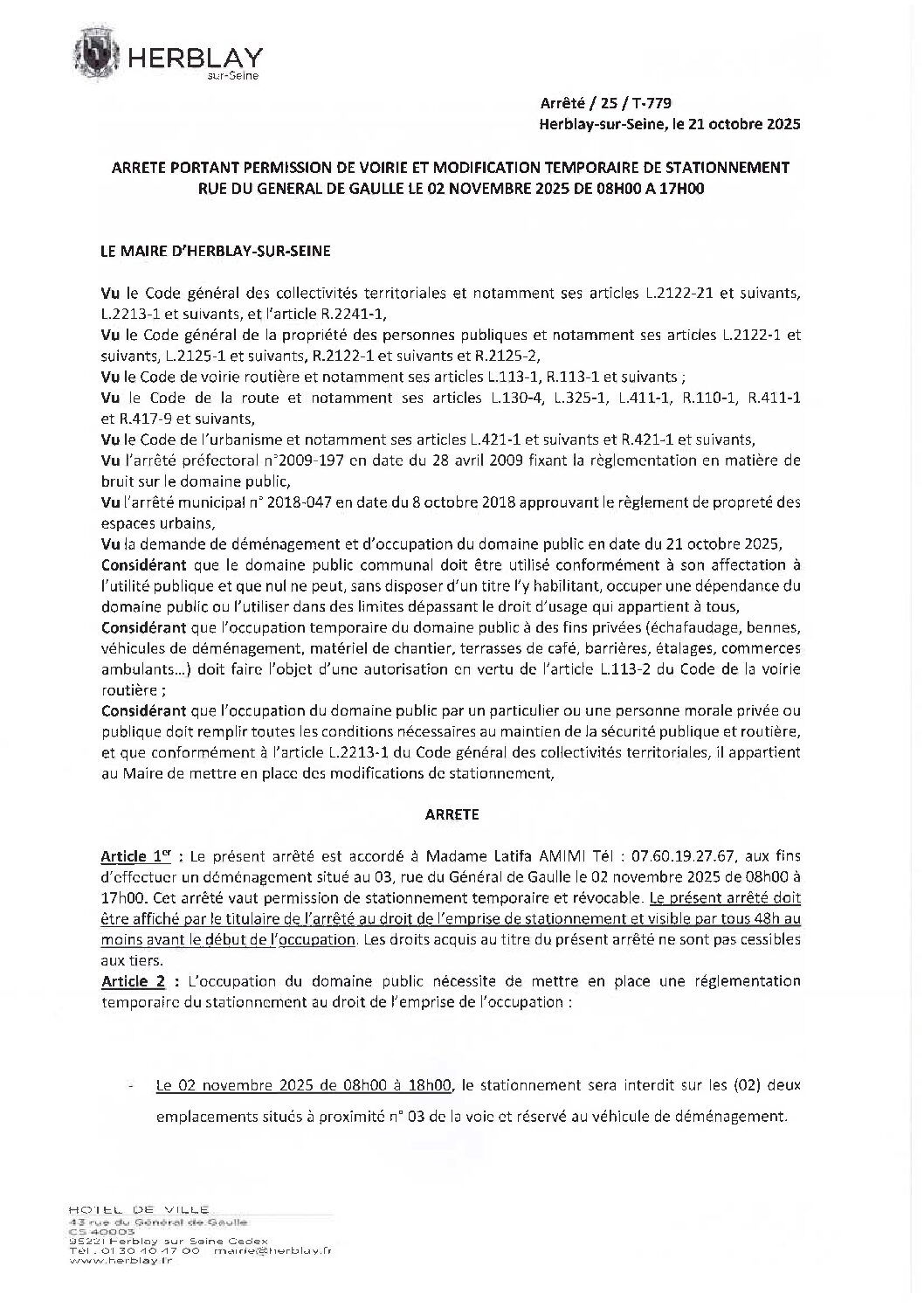 Arrêté portant permission de voirie et modification temporaire de stationnement rue du Général de Gaulle