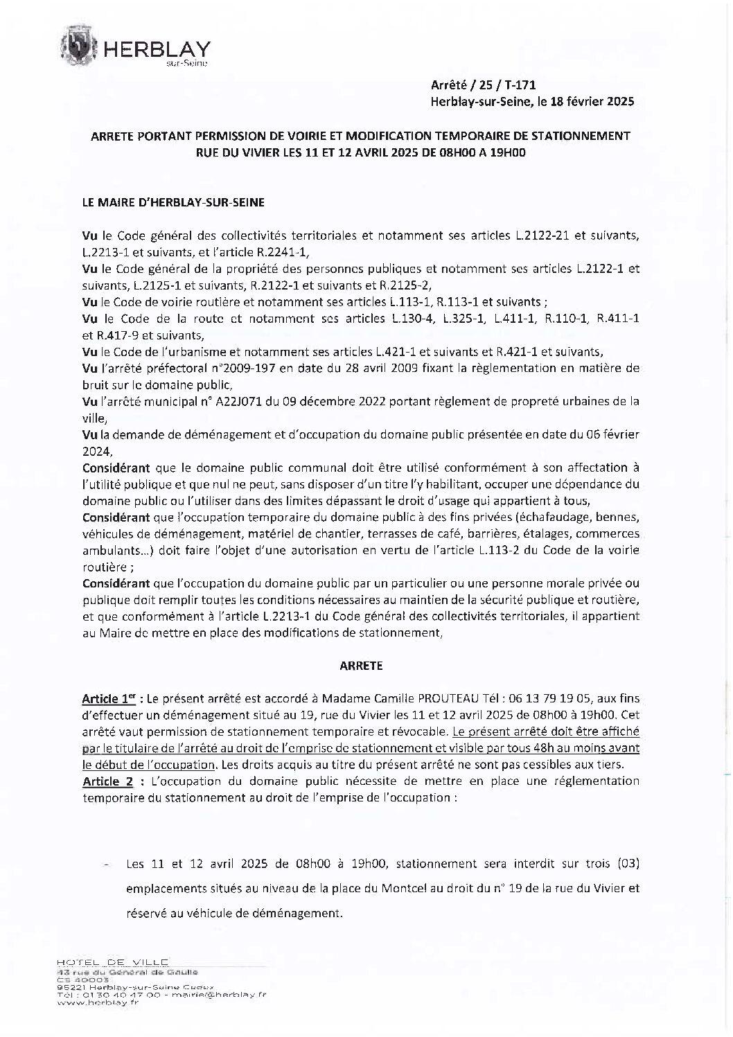 Arrêté portant permission de voirie et modification temporaire de stationnement rue du Vivier