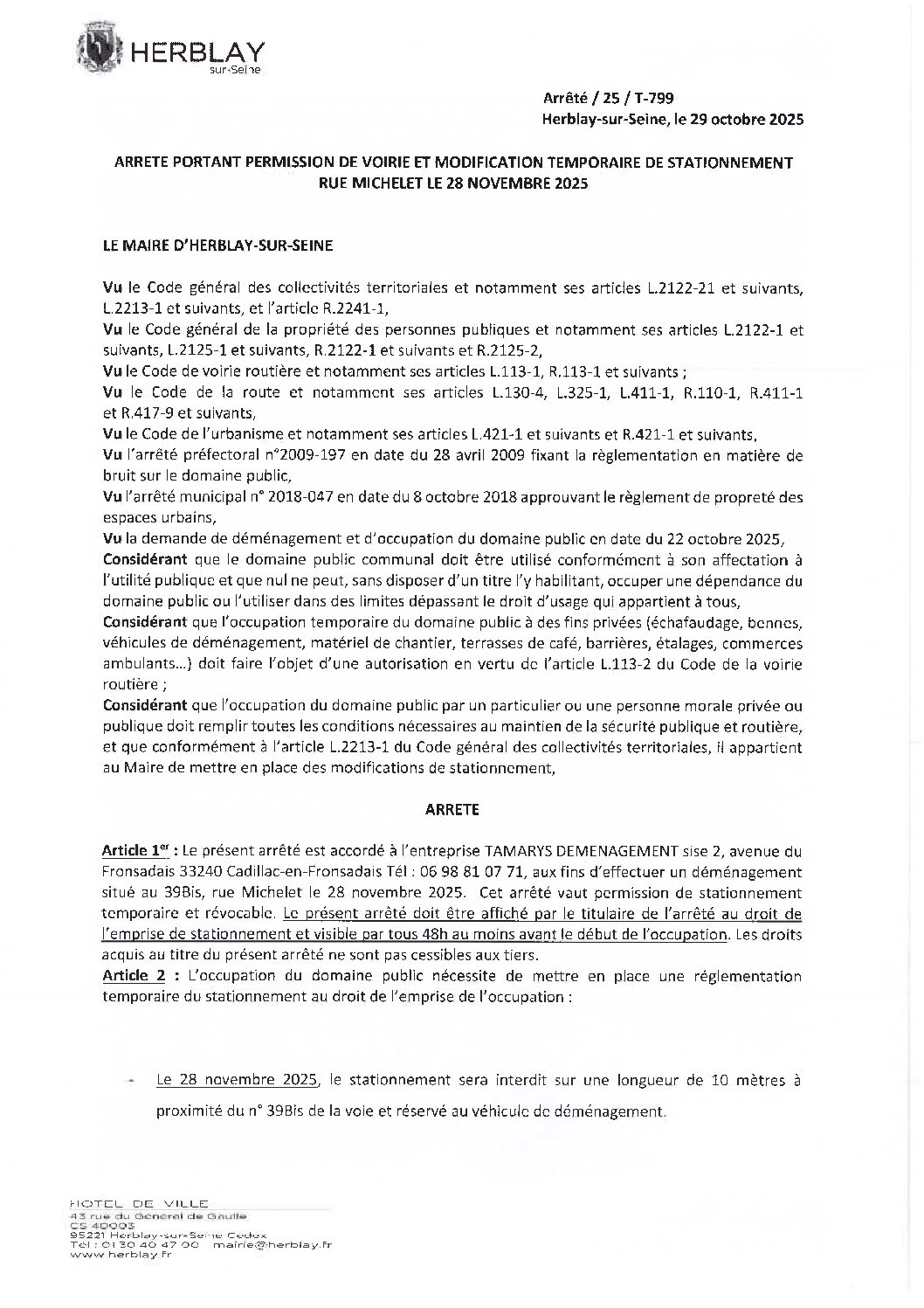 Arrêté portant permission de voirie et modification temporaire de stationnement rue Michelet