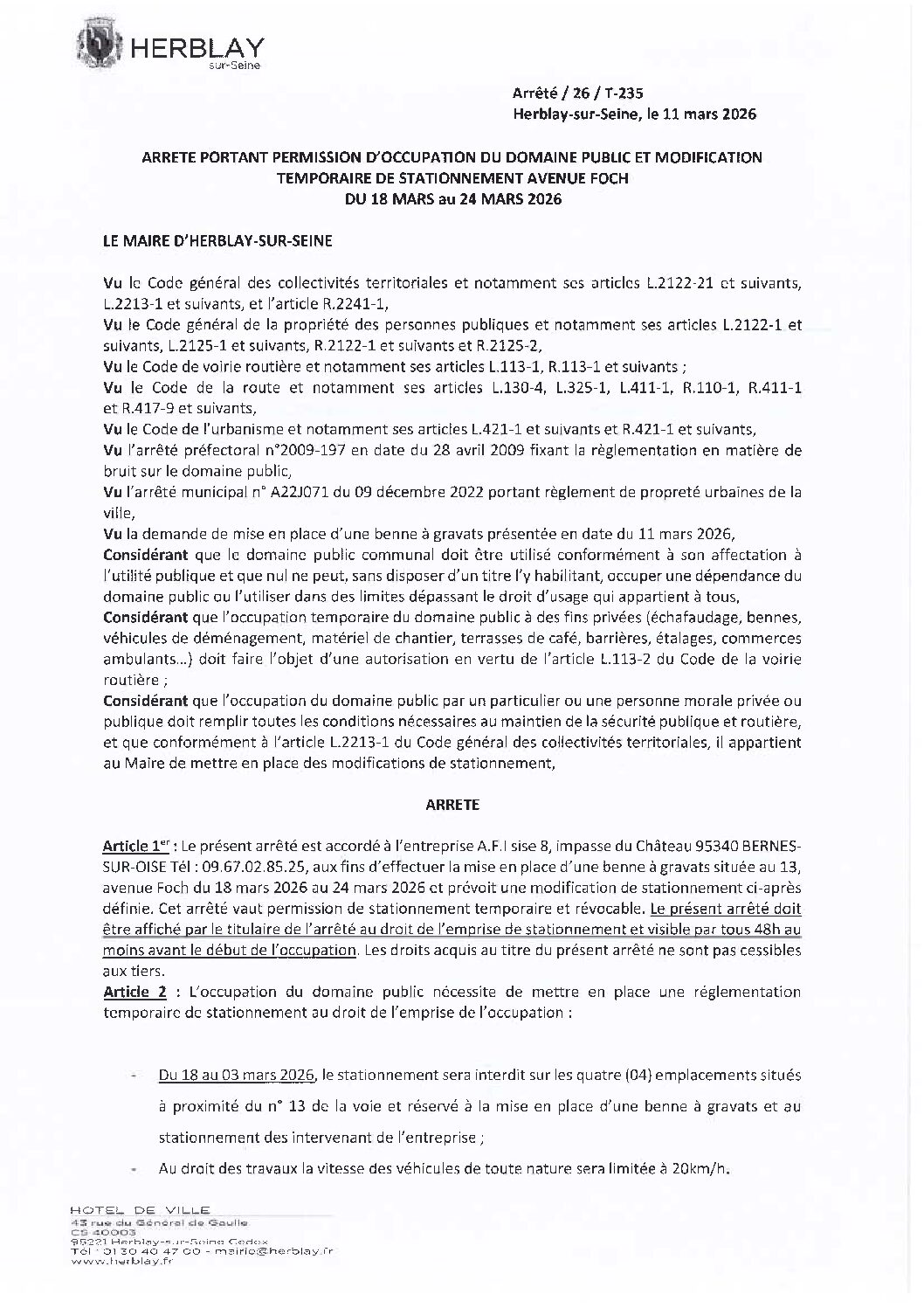 Arrêté portant permission d’occupation du domaine public et modification temporaire de stationnement avenue Foch