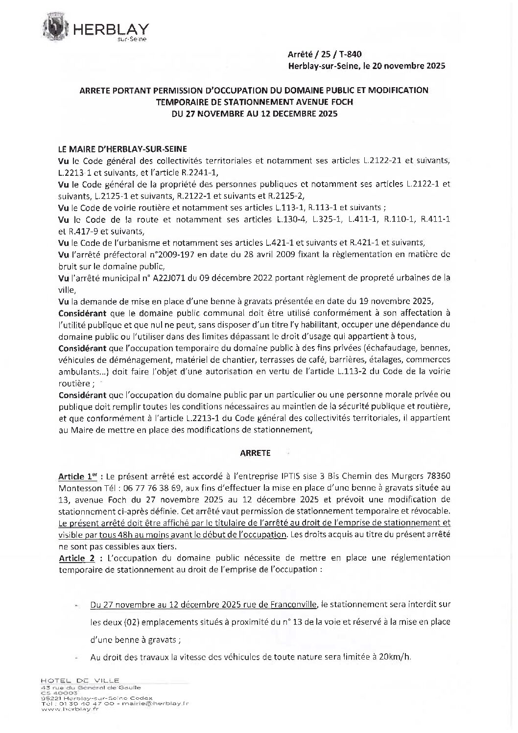 Arrêté portant permission d’occupation du domaine public et modification temporaire de stationnent avenue Foch