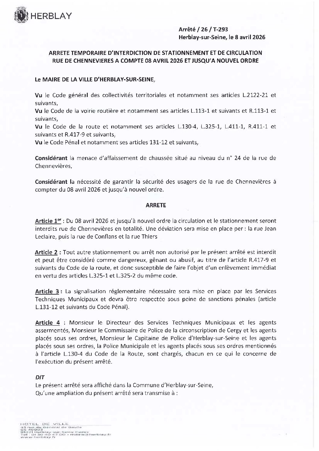 Arrêté temporaire d’interdiction de stationnement et de circulation rue de Chennevières
