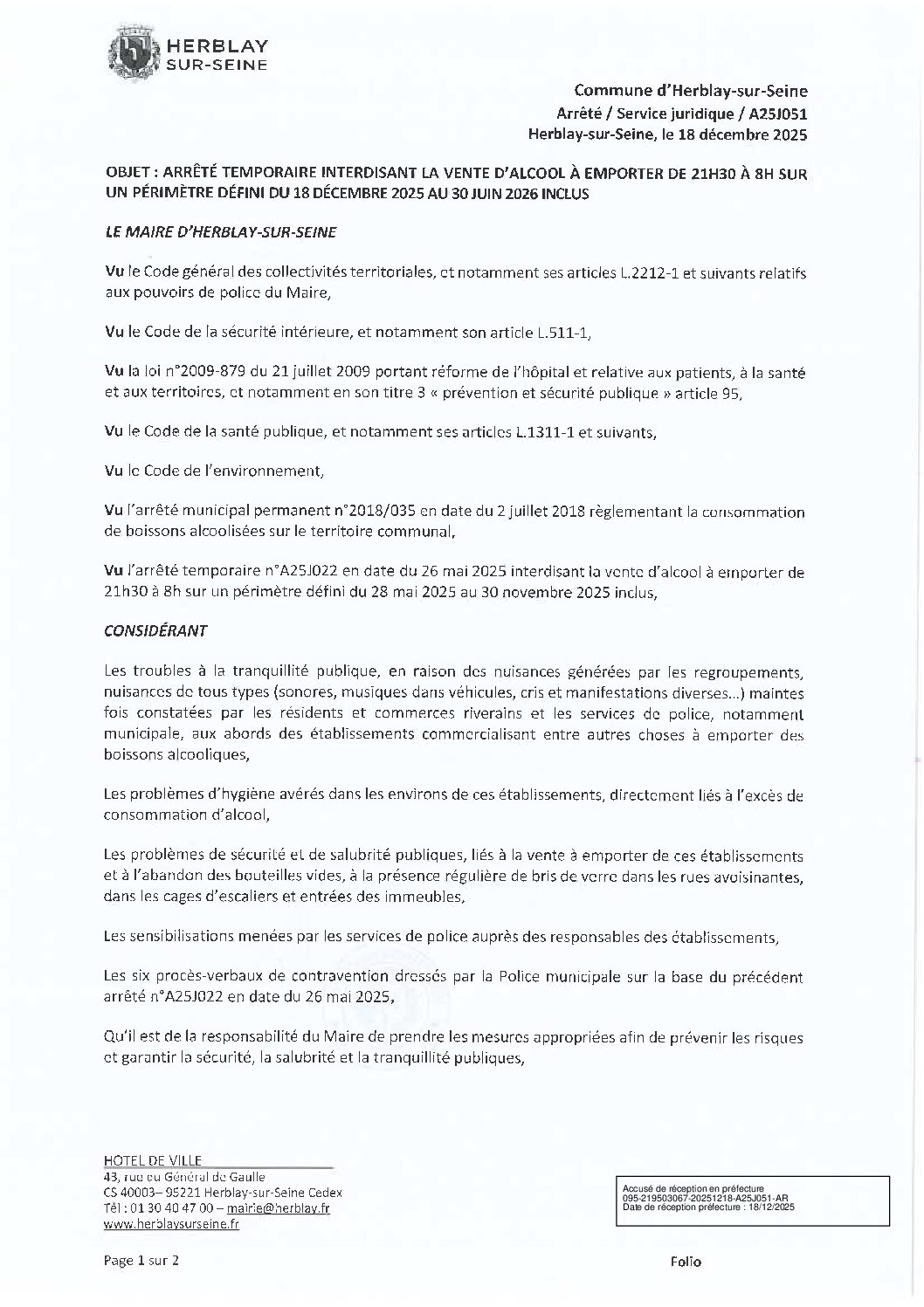 Arrêtés : Arrêté temporaire interdisant la vente d’alcool à emporter de 21h30 à 8h dans un périmètre défini du 18 décembre 2025 au 30 juin 2026 inclus 18/12/2025