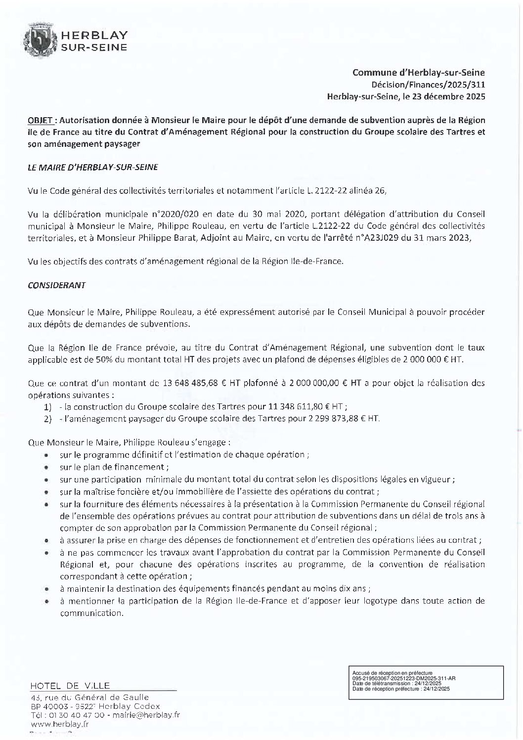 Autorisation donnée à M. le Maire pour le dépôt d’une demande de subvention auprès de la Région IDF au titre du contrat d’aménagement régional pour la construction du groupe scolaire des Tartres et son aménagement paysager