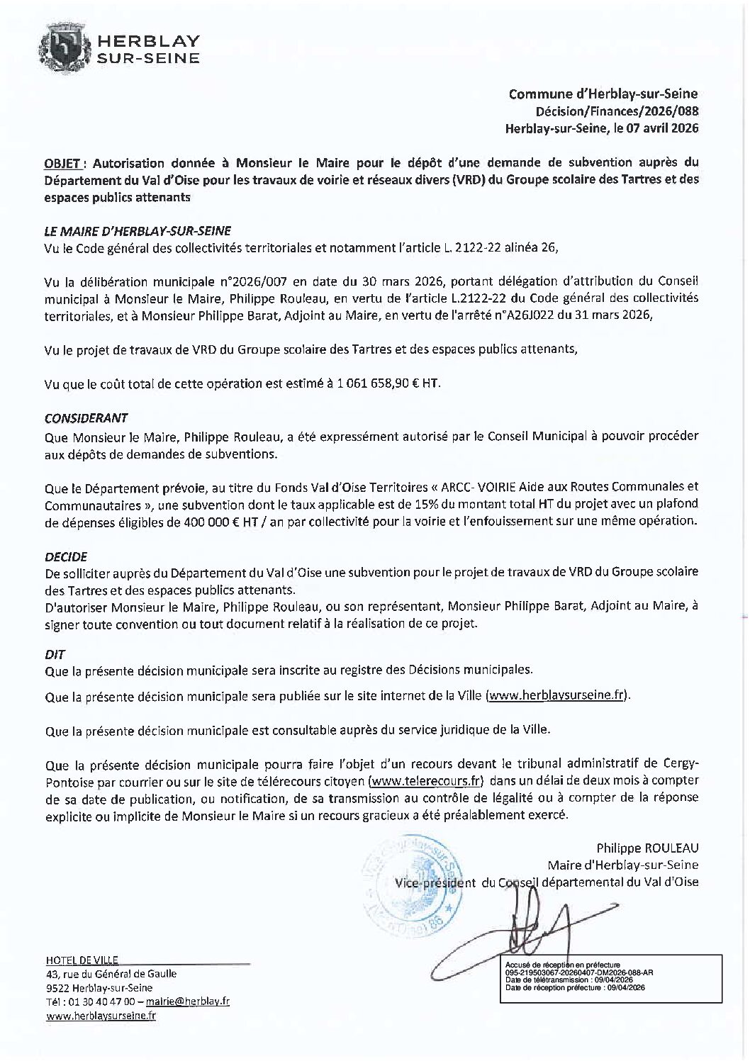 Décisions:Autorisation donnée à Monsieur le Maire pour le dépôt d’une demande de subvention auprès du Département du Val d’Oise pour les travaux de voirie et réseaux divers (VRD) du Groupe scolaire des Tartres et des espaces publics attenants09/04/2026