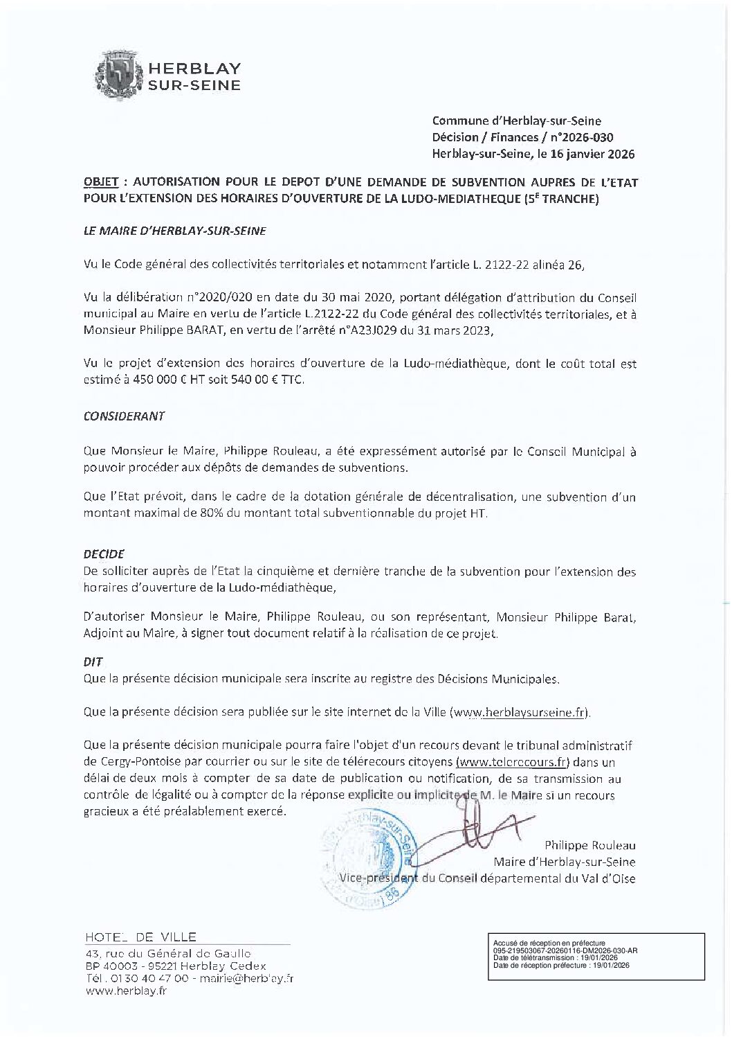 Autorisation pour le dépôt d’une demande de subvention auprès de l’État pour l’extension des horaires d’ouverture de la ludo-médiathèque (5ème tranche)